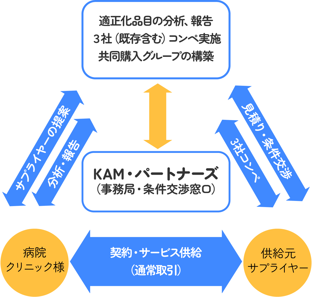 当社の名称の由来である「キーアカウントマネジメント(KAM)」とは、企業にとって特に重要なお客様との長期的な関係構築を目的とした戦略的アプローチを意味します。単なる営業活動ではなく、お客様の課題を深く理解し、ともに解決策を見出すパートナーシップの実現こそが、私たちの目指す支援のあり方です。これからも医療機関の皆様にとって信頼できるパートナーとして歩んでまいります。